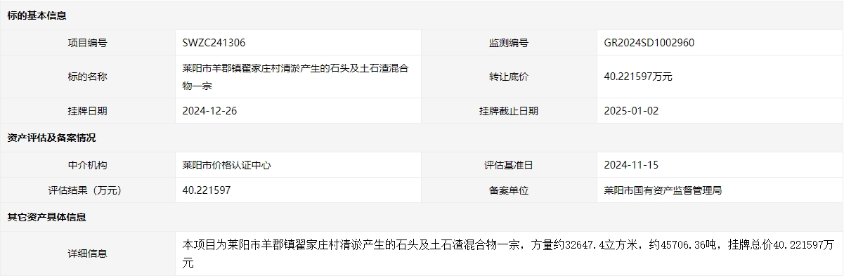 萊陽市氣象局照旺莊鎮(zhèn)南侯家夼村雷達建設產(chǎn)生大理石巖石頭及土石渣混合物一宗交易公...