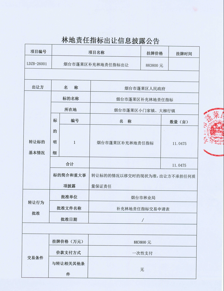 煙臺市蓬萊區(qū)補(bǔ)充林地責(zé)任指標(biāo)出讓